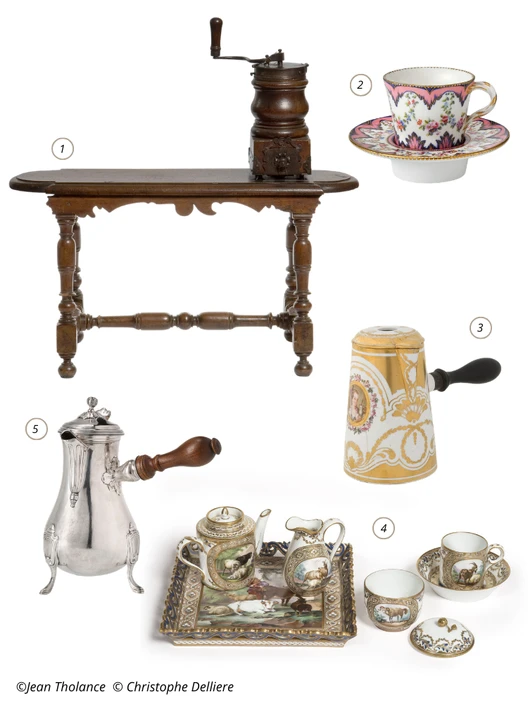 Les rituels liés aux boissons dites « exotiques » y occupent une place centrale, témoignant de leur rôle dans les usages sociaux et l’émergence de nouvelles formes de convivialité. Produits de luxe importés de contrées lointaines, le thé, le café et le chocolat inspirent alors la création de pièces d’orfèvrerie et de porcelaine d’une grande finesse, révélant une attention particulière portée au geste, au service et à l’élégance. Ces rituels incarnent, dès le XVIIIᵉ siècle, une expression très aboutie de l’art de vivre à la française.