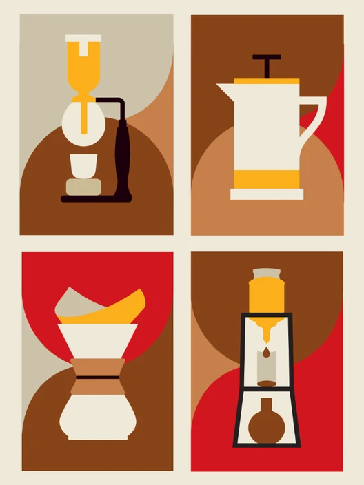 De la cafetière Siphon, héritier de la mythique Cona des années 50, à la French Press, appréciée pour sa simplicité et son esprit convivial, chaque procédé met en lumière les nuances aromatiques avec finesse. La Chemex, icône au design épuré née dans les années 40, offre une extraction délicate, libérée de toute amertume. La filtration à froid s’inscrit également dans cette approche avec un goutte-à-goutte presque hypnotique qui révèle les arômes ronds et concentrés du café.