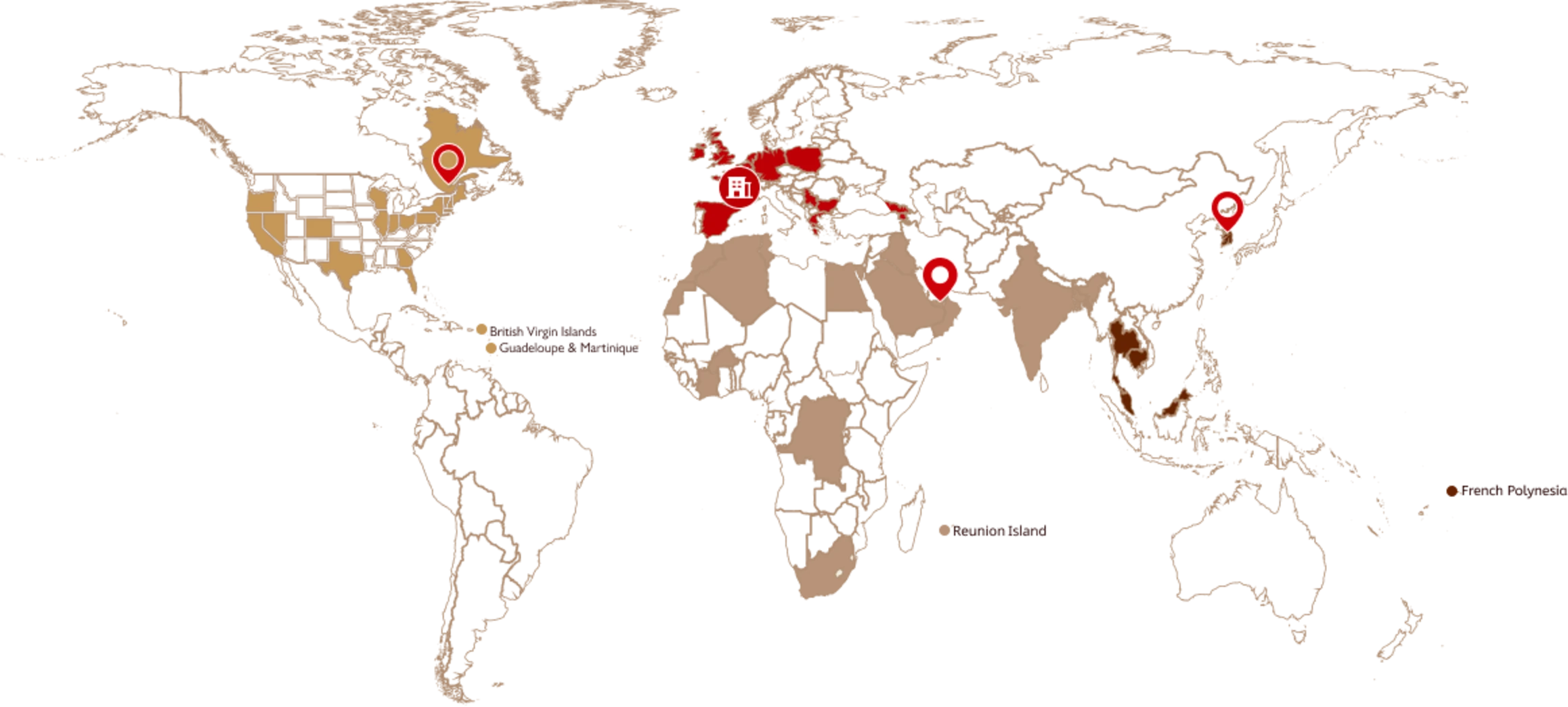 Algeria, Saudi Arabia, Bahrain, Bangladesh, Burkina Faso, Congo, Ivory Coast, Egypt, United Arab Emirates, India, Kuwait, Lebanon, Morocco, Oman, Qatar, Réunion, Tunisia, South Africa, Iraq.